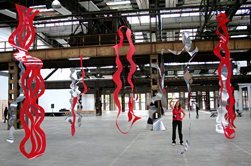 ![]() "Mobiles Spiel" (Lokhalle 2010) Installation mit 12 hängenden Objekten ![]() (Kunststoff und Spiegelfolie, Nylonfaden, 1000x1000x500 cm) ![]() |